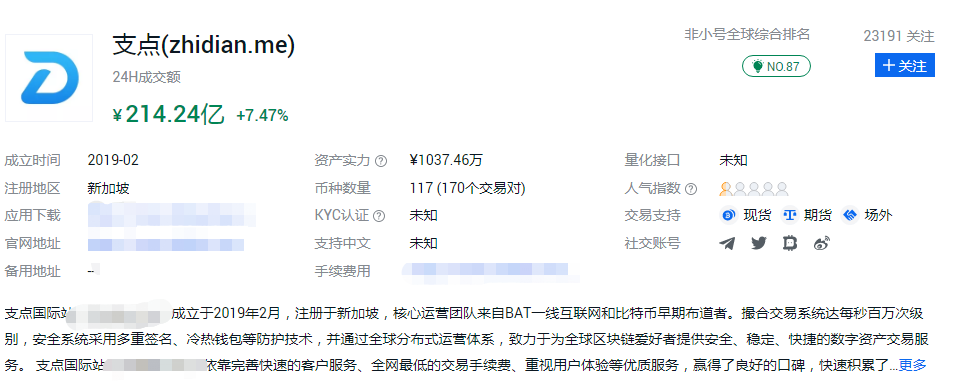 根据非小号上记录,支点国际站(zhidian)成立于2019年2月,注册于新加坡,核心运营团队来自BAT一线互联网和比特币早期布道者。