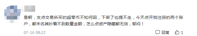 甚至于就在上个月,还有用户爆料在支点交易所买的超零币被莫名其妙的下架了,想提也踢不走,甚至就连自己注册的两个账户都看不到金额数量。